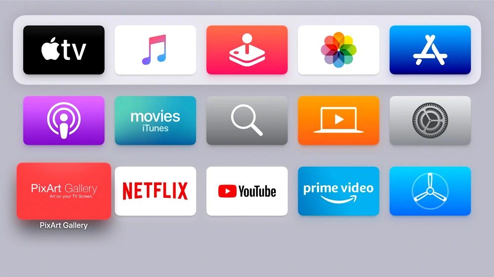 This is the home screen of the Apple TV device. A similar screen is available for Android TV and Fire TV. Click to open the "PixArt Gallery" TV App.