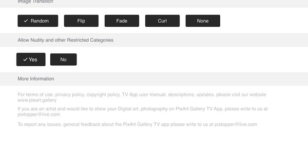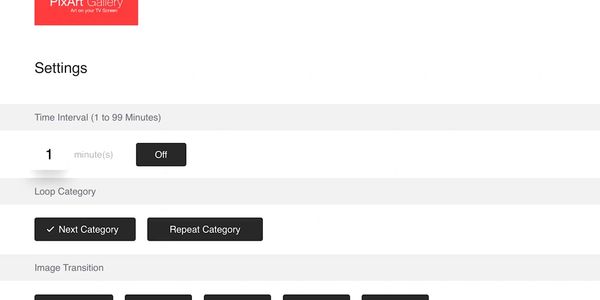 Set the time interval between images during slideshow. Minimum is 1 minute for subscribed users and 5 minutes for free-tier users. Also set Next/Repeat Category to move to the next category or to loop your selected/favorite category. You can also set the Image Transition of your choice.
