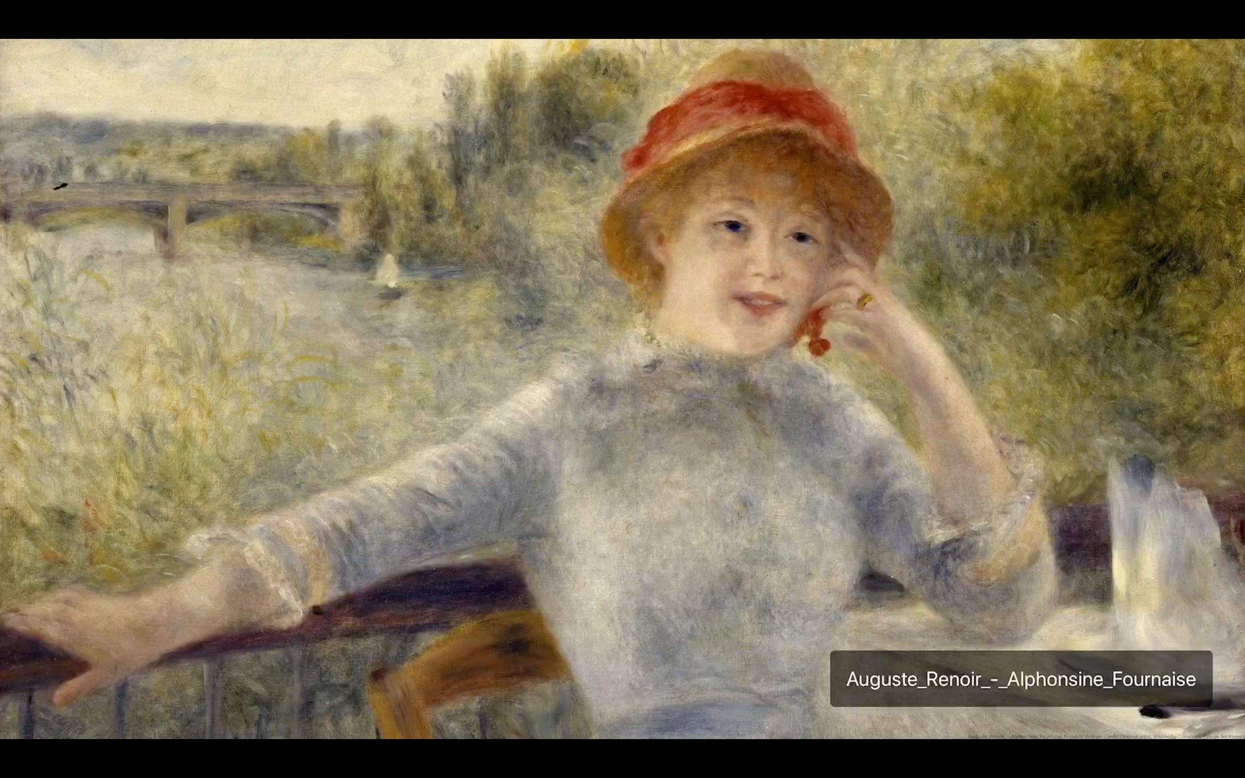 You can pause and play the slideshow using your TV device's remote. When you pause, you can view the title of the artwork. If interested, you may search for the artwork on the internet using this title to get a history, story that this artwork depicts.